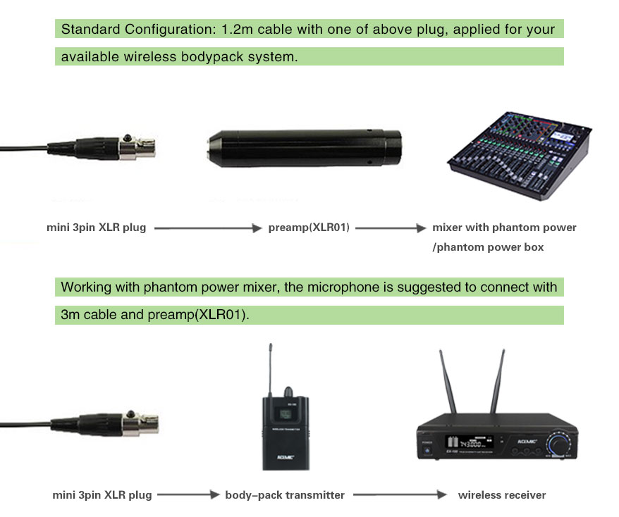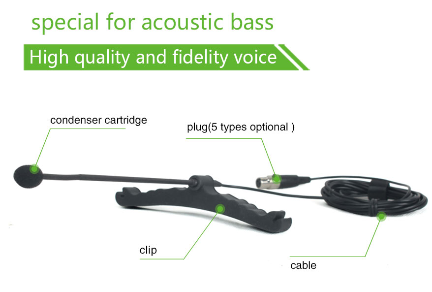 Microphone type: CondenserDirectivity: Omni-directionalCartridge size: Φ4.0*1.5mmSensitivity: - 47db±2dBFrequency response: 65Hz-8KHzOutput impedance: ≤2.2 kΩWorking voltage: 2.0V-10V.DCARM: 160MMS/N ratio: >63dBCable length: 1.2m standard, 3m optionalFitting Instrument: Double Bass
