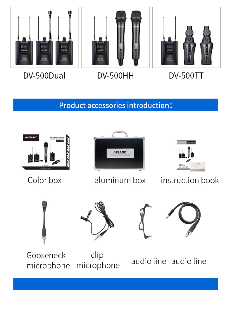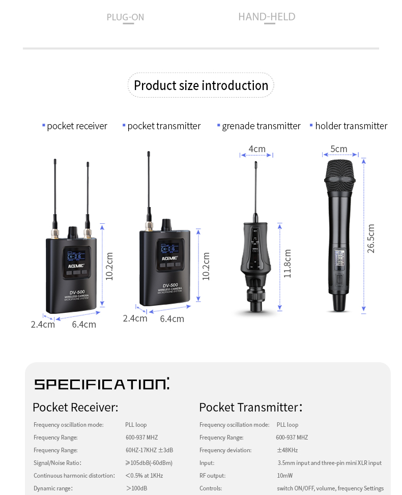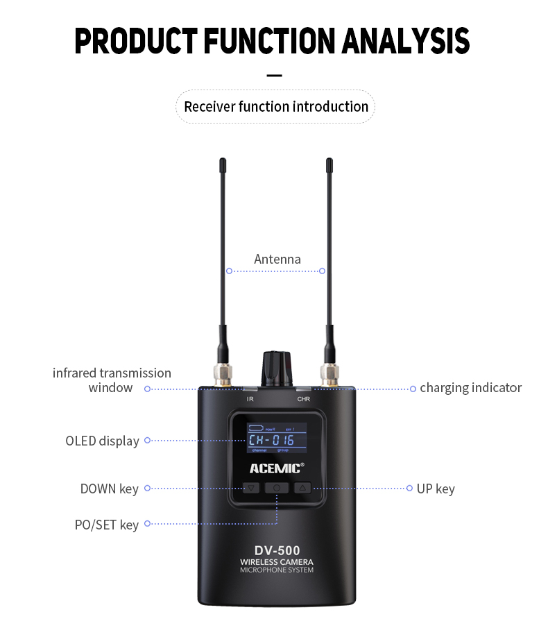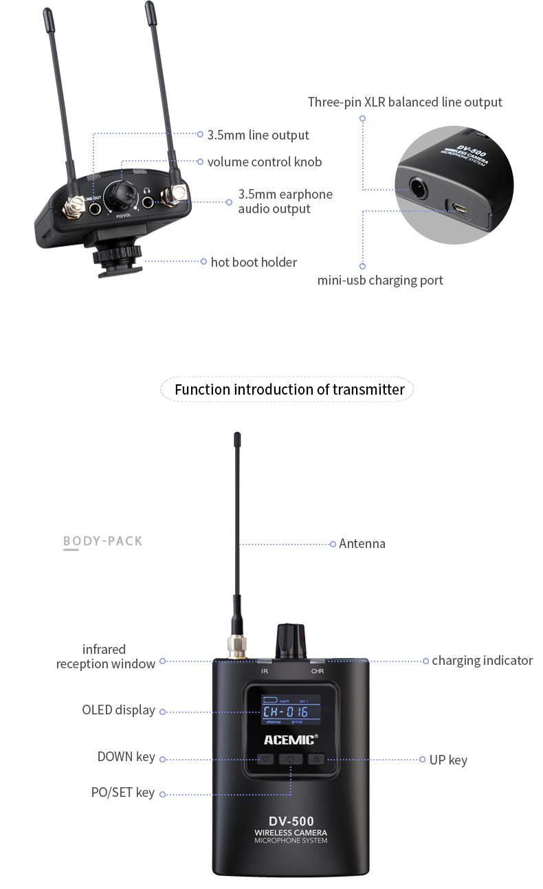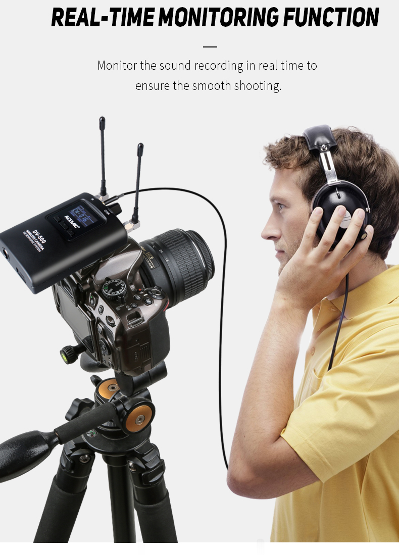 About this item:【Superior Sound & Noise Reduction】The wireless camera microphone features UHF Ultra High-Frequency radio wave technology and dual-antenna design, which enhances the anti-interference ability to ensure stable signal transmission and record clear sound. It features intelligent noise reduction function, can significantly reduce environmental and wind noise.【Wide Compatibility】You can mount the receiver to DSLR Camera, XLR Camcorder, iPhone, Android smartphone, Laptop and PC. The wireless camera microphone is widely used for YouTube live streaming, Vlog recording, interview, program hosting, podcast, presentation, church, wedding.【100 Selectable UHF Channels】The wireless camera microphone package includes 1 Receiver+2 transmitters, so the DV-500Dual support 1-2 people recording at the same time. Every transmitter can select 2 channels, flexible channel matching. When other channels are disturbed in the same space or near distance, you can quickly switch the channel to prevent interference. Working range of the microphone system up to 164 feet (50 meters) in open areas.【Charge and Work Time】The transmitter and Receiver are built-in 1000 mAh rechargeable lithium-ion batteries that can offer about 6-8 hours working time. USB cable has several mini USB for charge for the transmitters and receiver at the same time, fully charge is only 2.5 hours. The red light is on during charging and goes off when fully charged.【Real-time Audio Monitoring】Connect your favorite headphones to the receiver's 3.5mm headphone jack, you can listen the sound while recording, and monitor the audio status to complete the recording at one time. Daylight-readable displays on the transmitters show volume, battery status and channels. The wireless camera microphone's display on the receiver show connection quality of every transmitter and battery status.