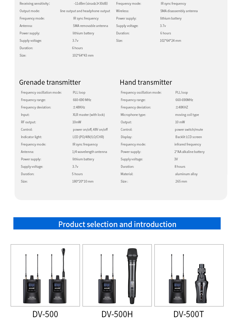 (606-630 MHz Optional), (USA: 902-928, UK: 863-865, ROK: 925-937 MHz)Frequency Deviation:±48KHzInput:3.5mm input and 3pin mini-XLR inputRF Output Power:10mWControls:Power ON//OFF, Volume, SET frequencyInterface:InfraredAntenna:SMA Detachable antennaPower Supply:Lithium batteryOperating Voltage:3.7VOperating time:6hDimensions( L*W*H):102*64*24mm