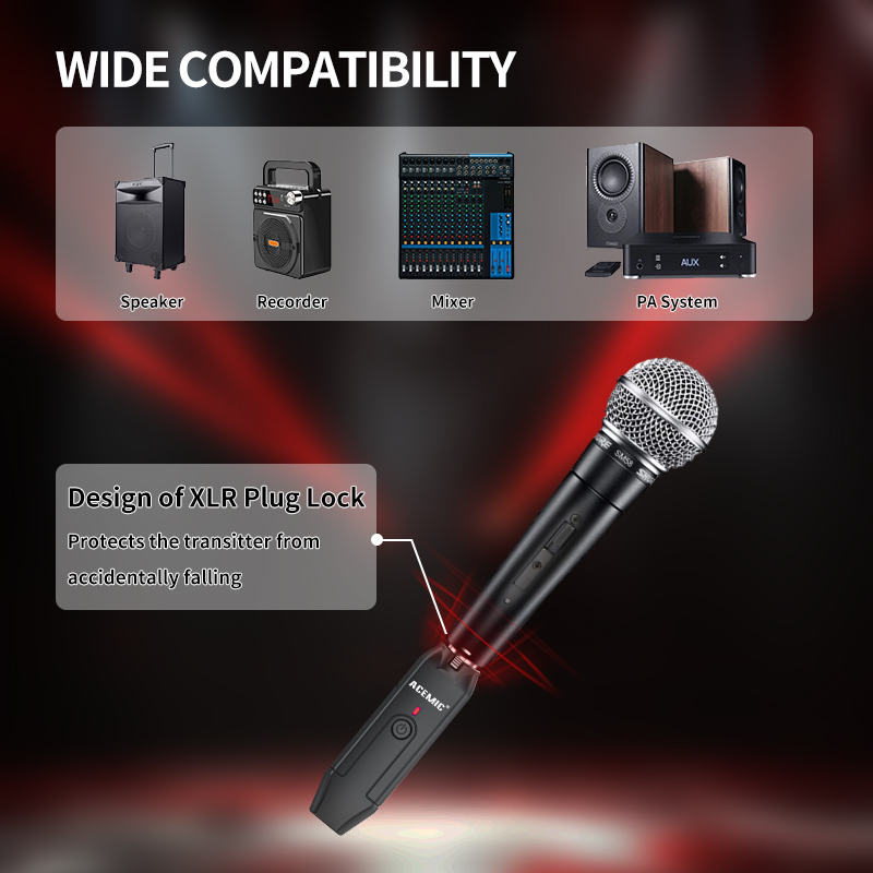 【Designed for Dynamic Mic】The wireless microphone adapter XLR works with any dynamic microphone, audio mixer, PA system, and provides stable and reliable wireless transmission, letting you get rid of cables and make your professional microphones wireless. (Not Compatible with Condenser Mics)