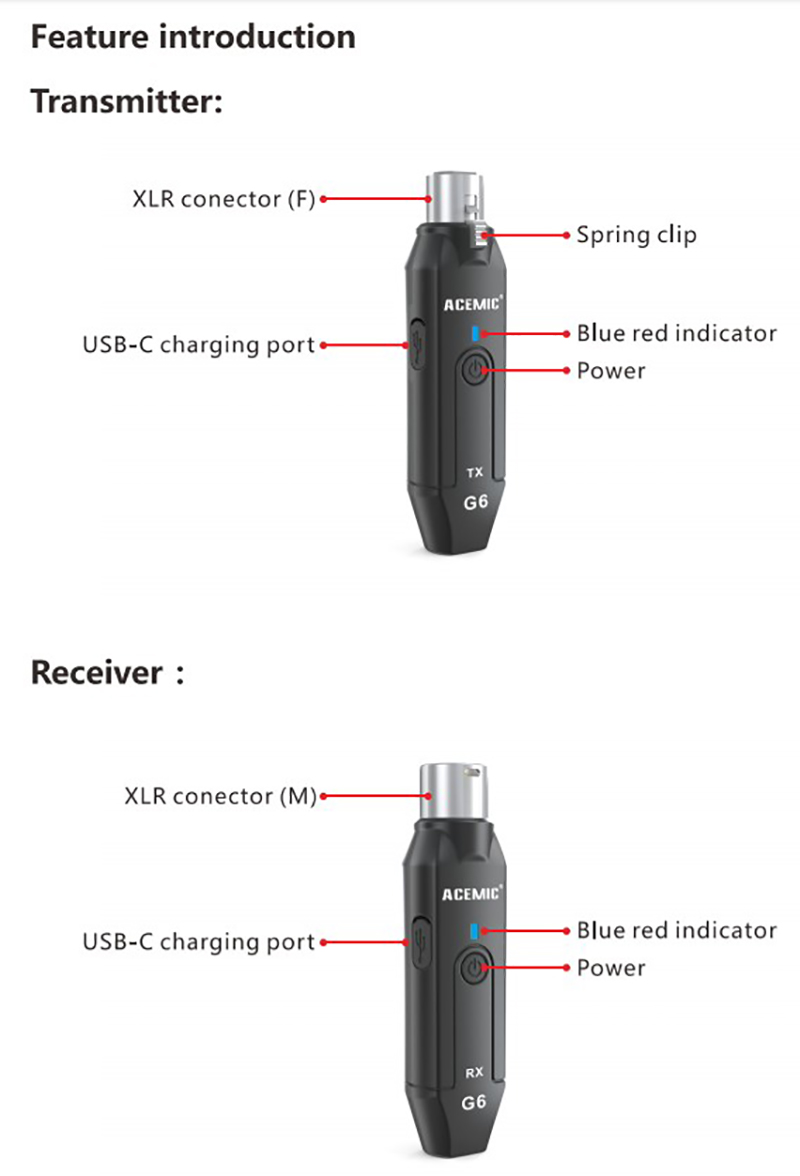 【Mute Function and 6-Channel】In power-on mode, a short press switches to mute and another short press unmute. The wireless microphone adapter has 6 channels and supports 3 sets of systems operating simultaneously without interference. One-to-one and no-interference. (TIPS: Ask us for the "Operation Guide" video if you are going to use 3 sets of G6 XLR wireless mic adapters.)