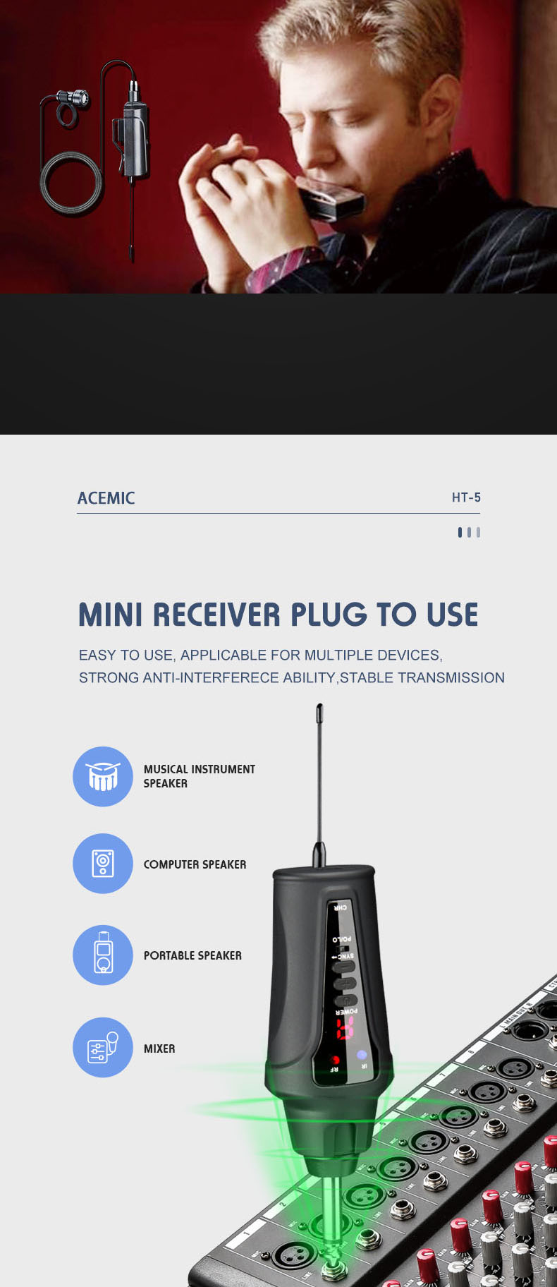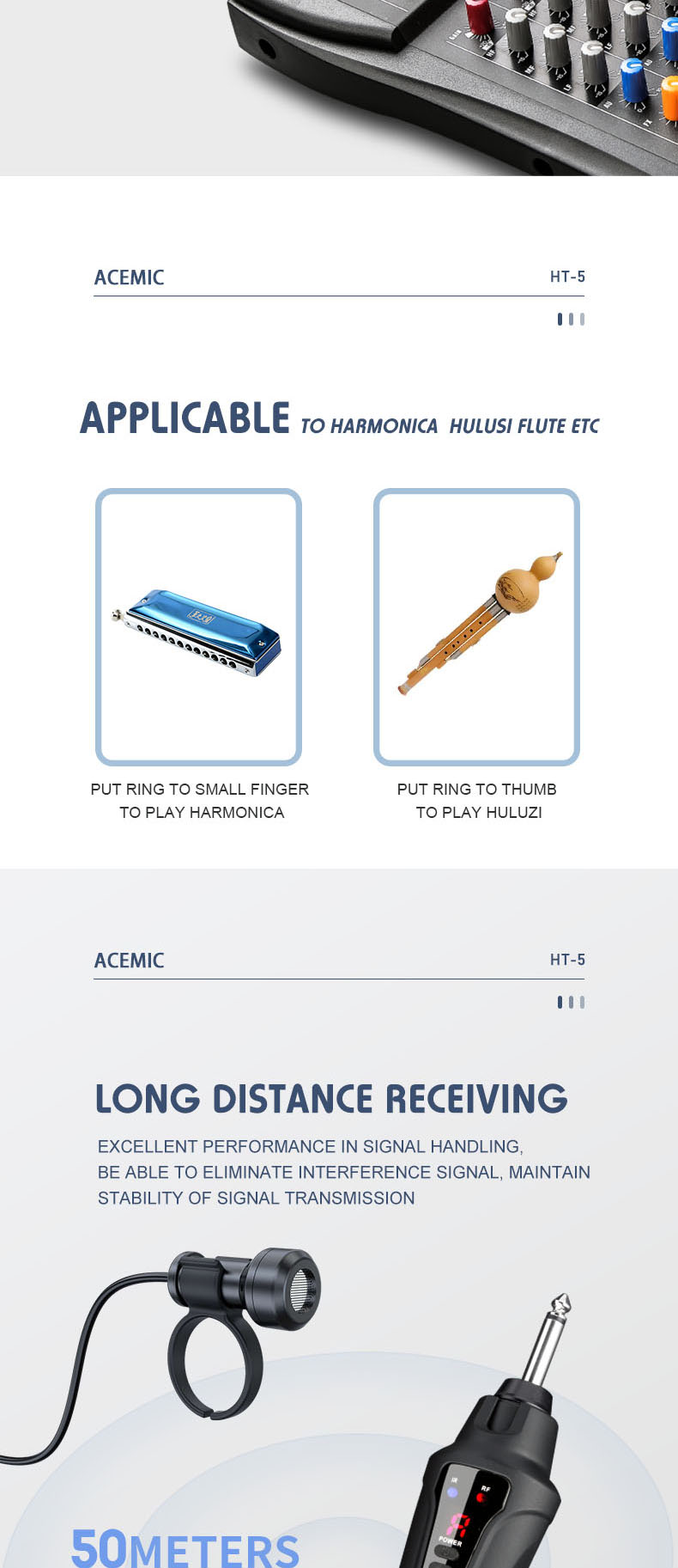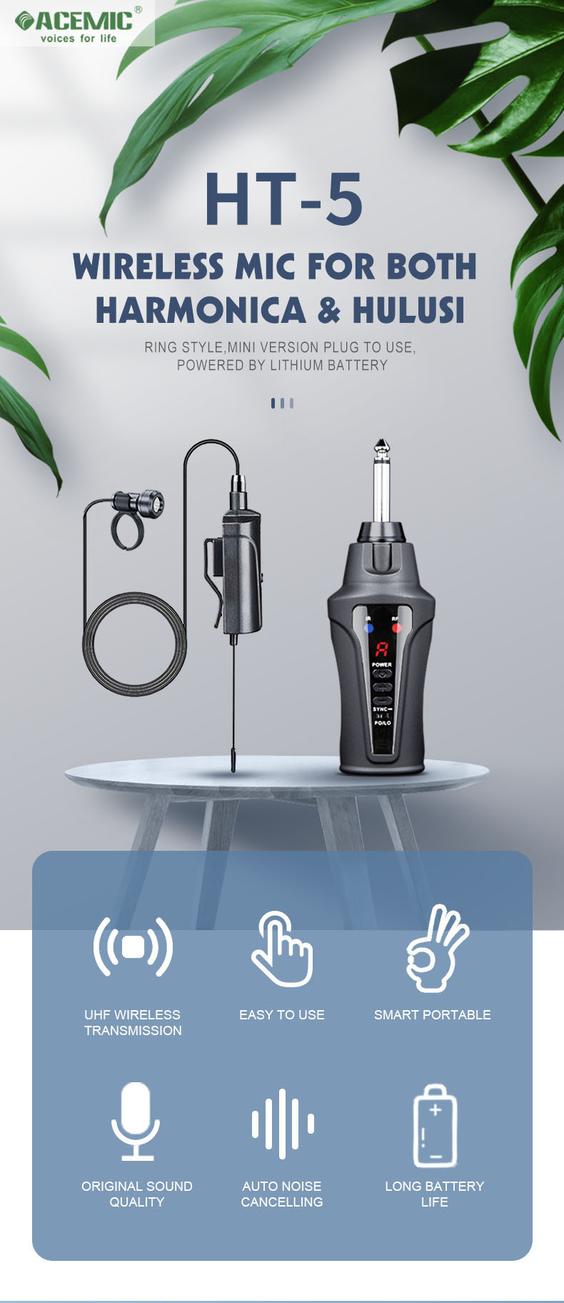 【Finger Ring Design】The wireless harmonica microphone adopts finger ring design,  with a small condenser mic propped up on the head of the ring. Hands free for your playing harmonica freely.