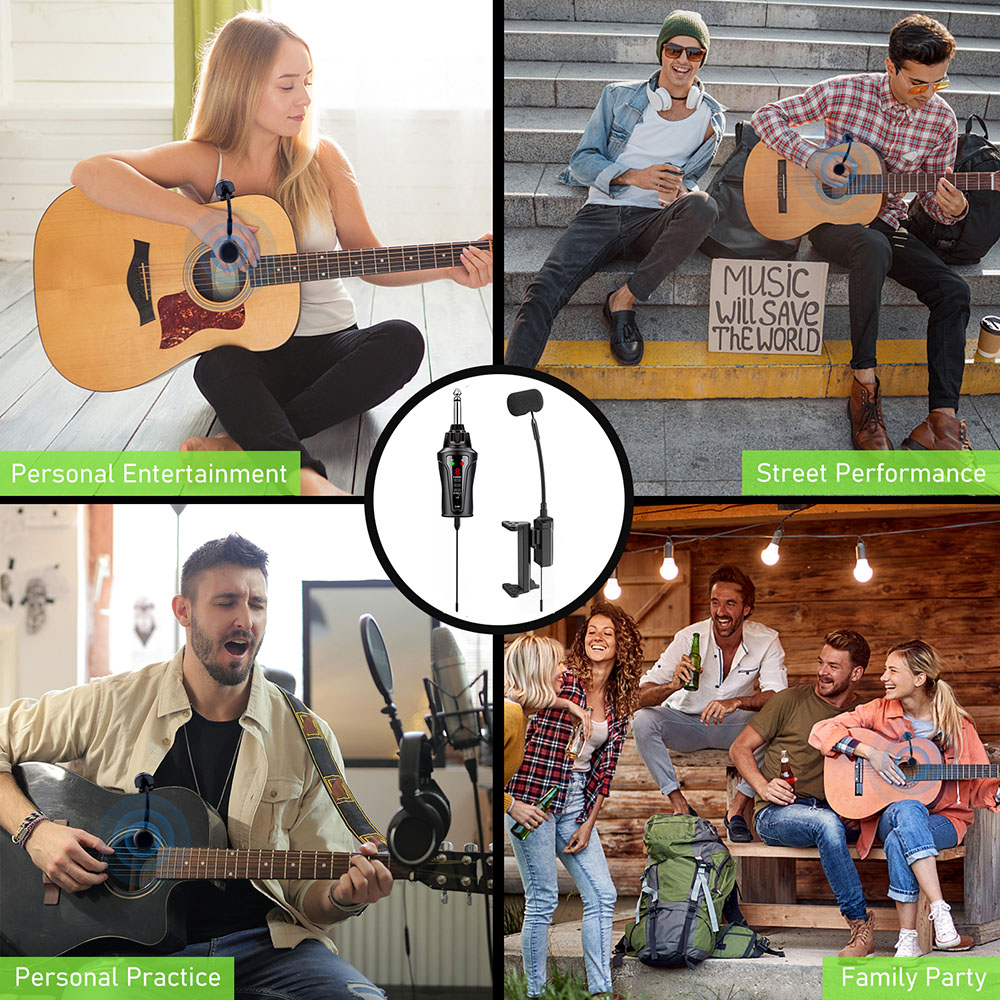 【Multi-scenario】The versatile wireless guitar microphone is ideal for a range of performances, including live gigs, solo performances, accompaniment performances, personal entertainment, school stage performances, personal practices, and small concerts. And you can use 4 systems simultaneously within the same frequency band.