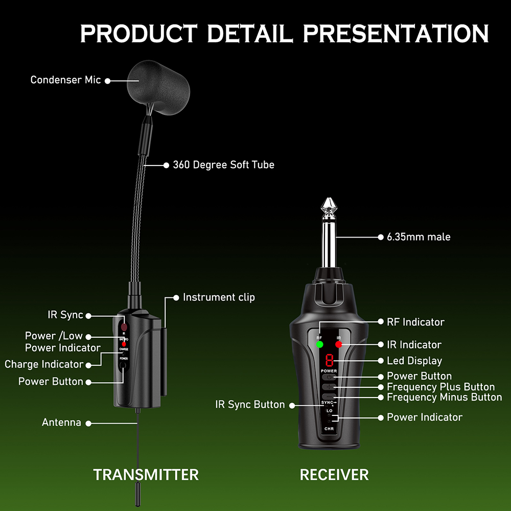 【High Quality Sound Reproduction】This JT-5 wireless guitar microphone, equipped with a built-in highly sensitive condenser microphone, perfectly captures the instrument's sound, making it clearer and more realistic. It offers 16 preset groups of adjustable channels to address potential interference issues.