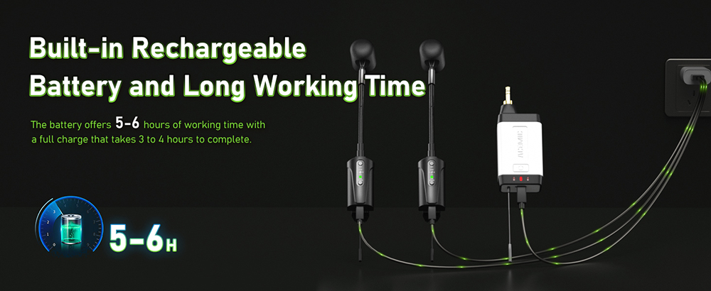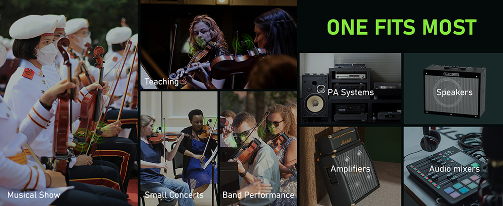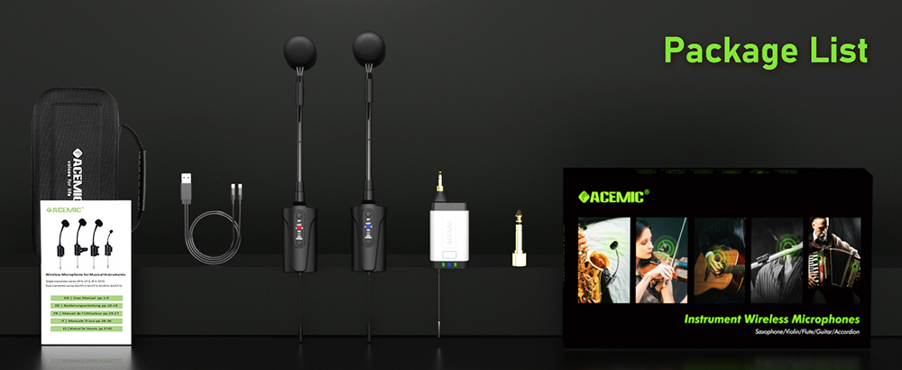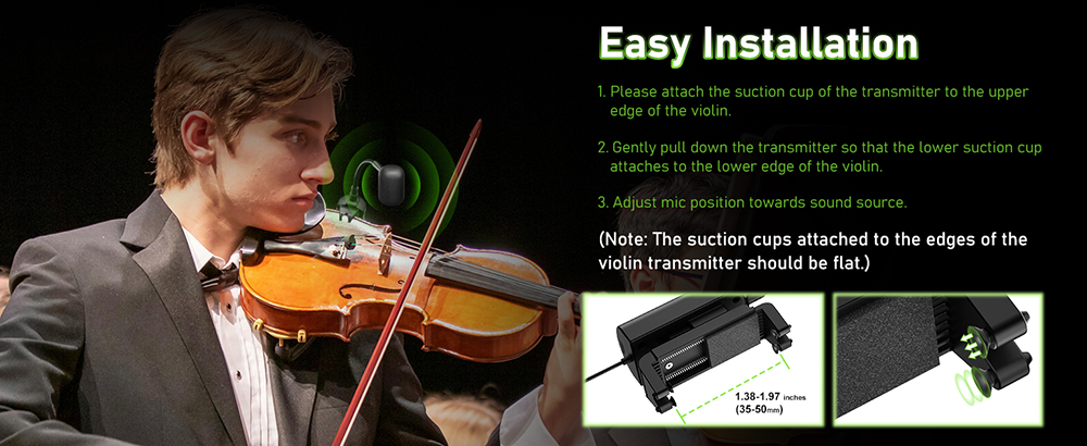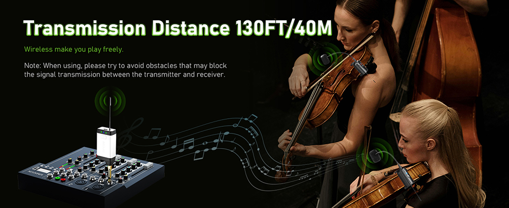 【UHF Stable Transmission】Q2/VT-5 is a dual-channel intelligent wireless violin microphone with ultra-low audio latency.This ensures high-quality sound transmission. The system offers stable transmission up to 130 feet in open areas. (Note: Please ensure that the antenna on the bottom of the receiver is correctly installed before formal use.)