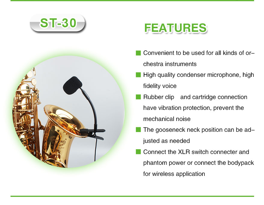 Whether you're performing jazz, classical, or pop, the ST-30 wired saxophone microphone delivers the professional audio quality you need to stand out.