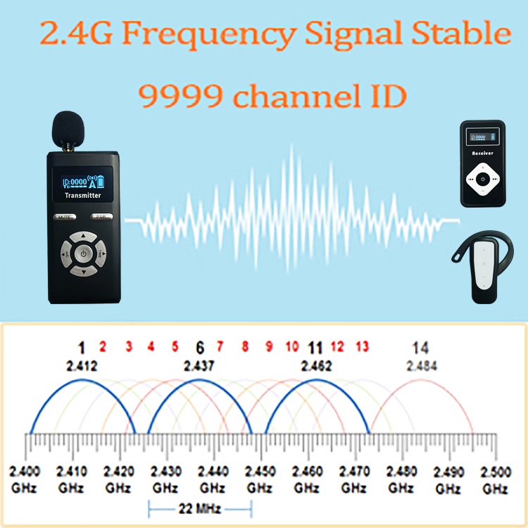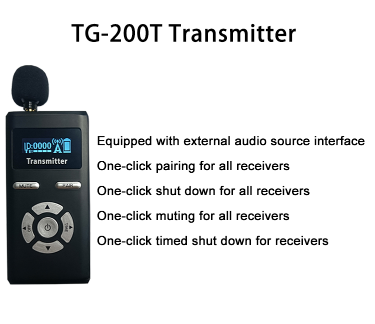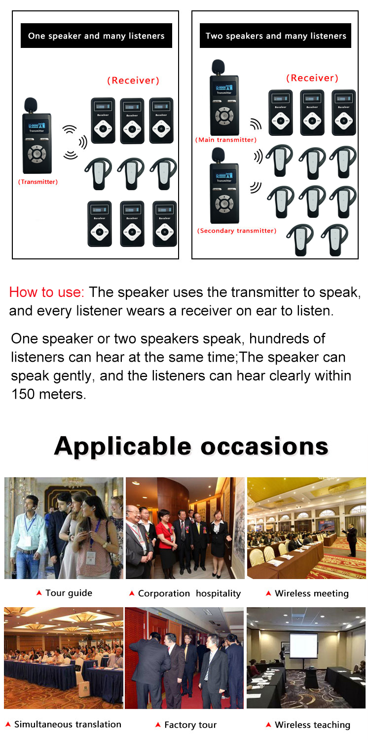 • Unified frequency modulation, easy to operate; Just set the transmitter, put receivers close to the transmitter, all the receivers channels will be automatically match the transmitter channel.